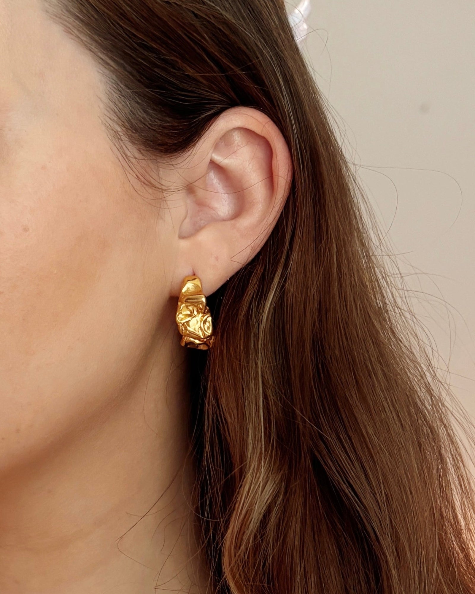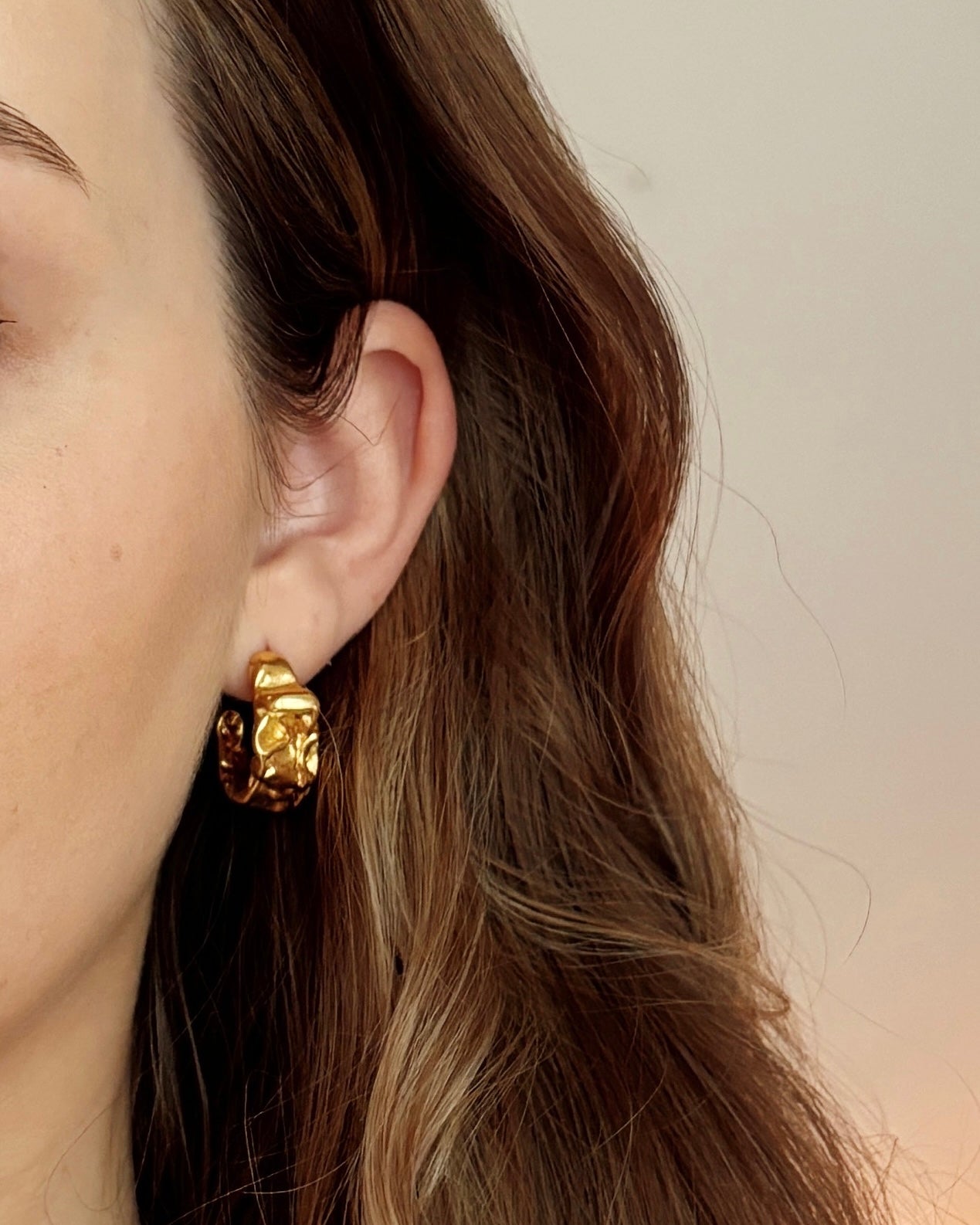Rappelant un morceau d’or brut, ces boucles d’oreilles uniques captent la lumière et subliment avec audace le style de celle qui les porte. Elles reflètent la valeur et l’éclat intérieur, pour un look à la fois naturel et sophistiqué.